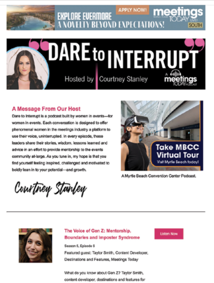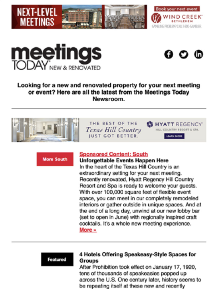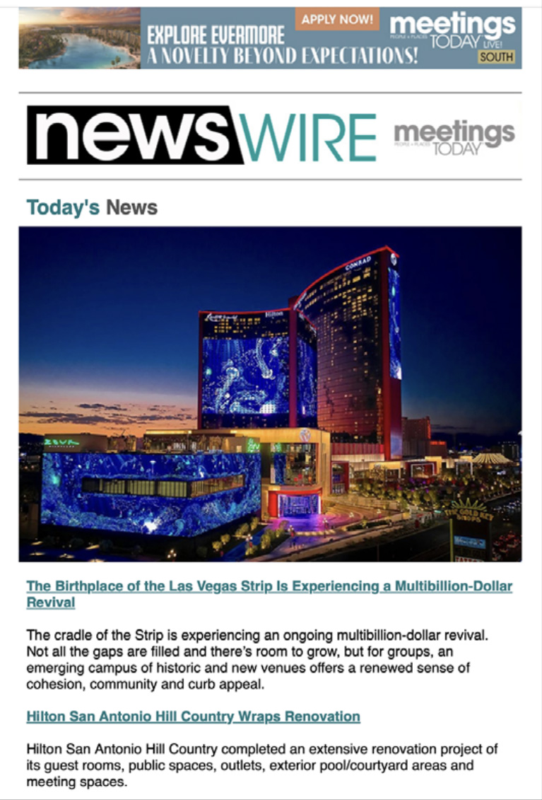 Planners subscribe to Meetings Today's eNewsletters to stay on top of the latest trends and news about the meetings and events industry, and you can reach these planners while they're engaged with the content they rely upon. Get your message out to our subscribers with the following: