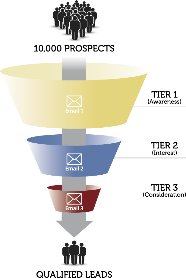 This is a three-step lead nurture program that utilizes a series of emails designed to guide potential customers along the sales journey, from awareness to consideration and ultimately, to purchase.